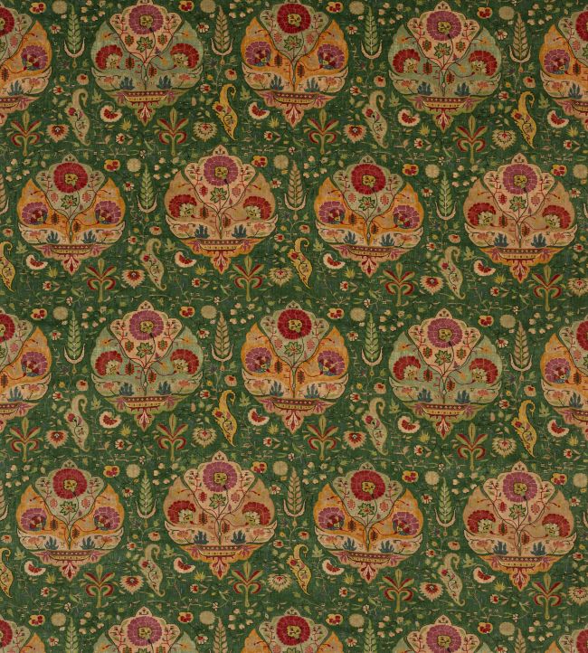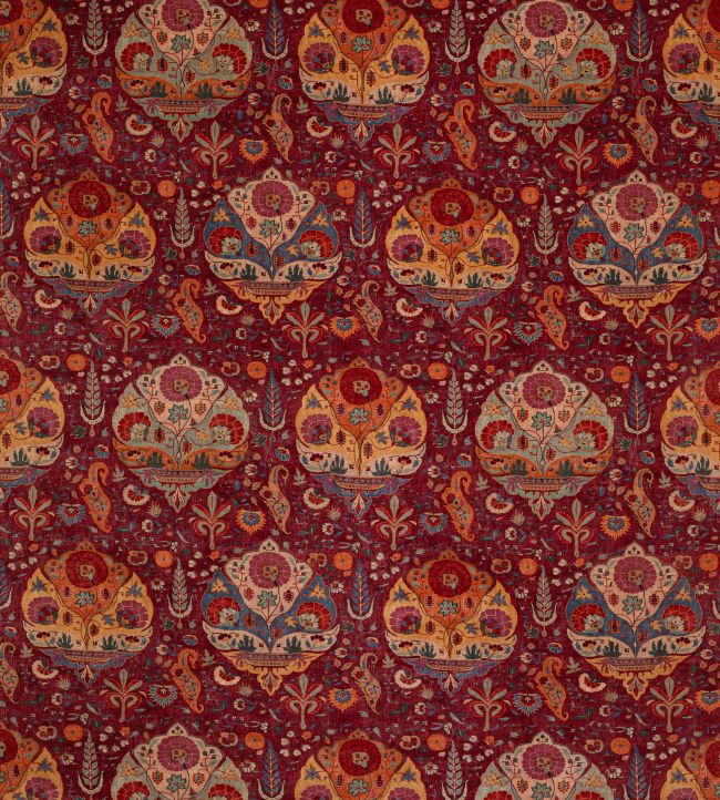 Darya Velours förvandlar ett sÀllsynt pashminaarkiv frÄn 1800-talet frÄn Kashmirregionen till en fantastisk tryckt design pÄ lyxig bomullssammet. Ornamentala medaljonger, prydda med flytande, invecklade motiv, vilar graciöst mot en bakgrund av arabesker och böljande vÀxtrankor. Patinan och de delikata texturvariationerna har noggrant bevarats och fÄngar djupet och rikedomen i detta mÄngfÀrgade mÀsterverk.