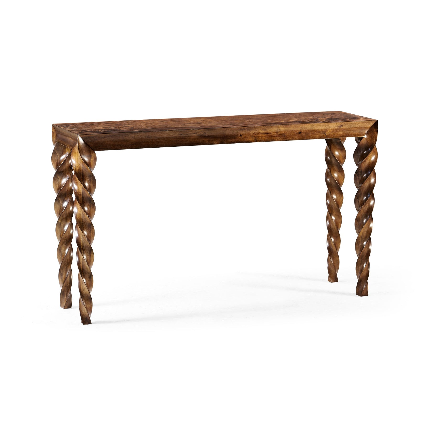 Modernt utformat handsnidad rektangulÀr konsolbord i valnötsfinish med skarpt definierade avsmalnande kornvridna ben.