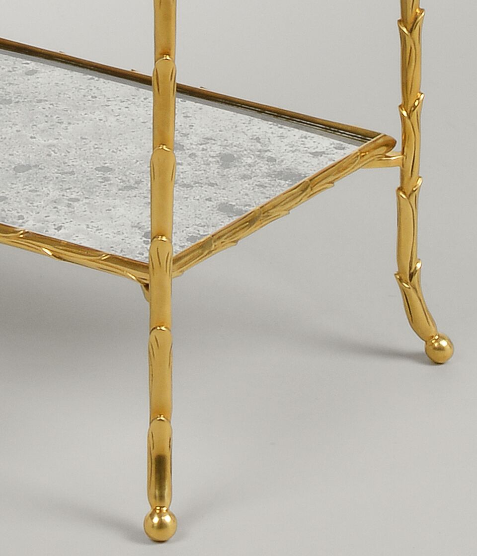 Det hÀr eleganta bordet har inspirerats av ett originalföremÄl frÄn 1940-talet som köptes i en antikaffÀr i Paris. Den gjutna mÀssingsramen Àr avslutad med akantusbladdekoration som kompletterar de antika spegelhyllorna.