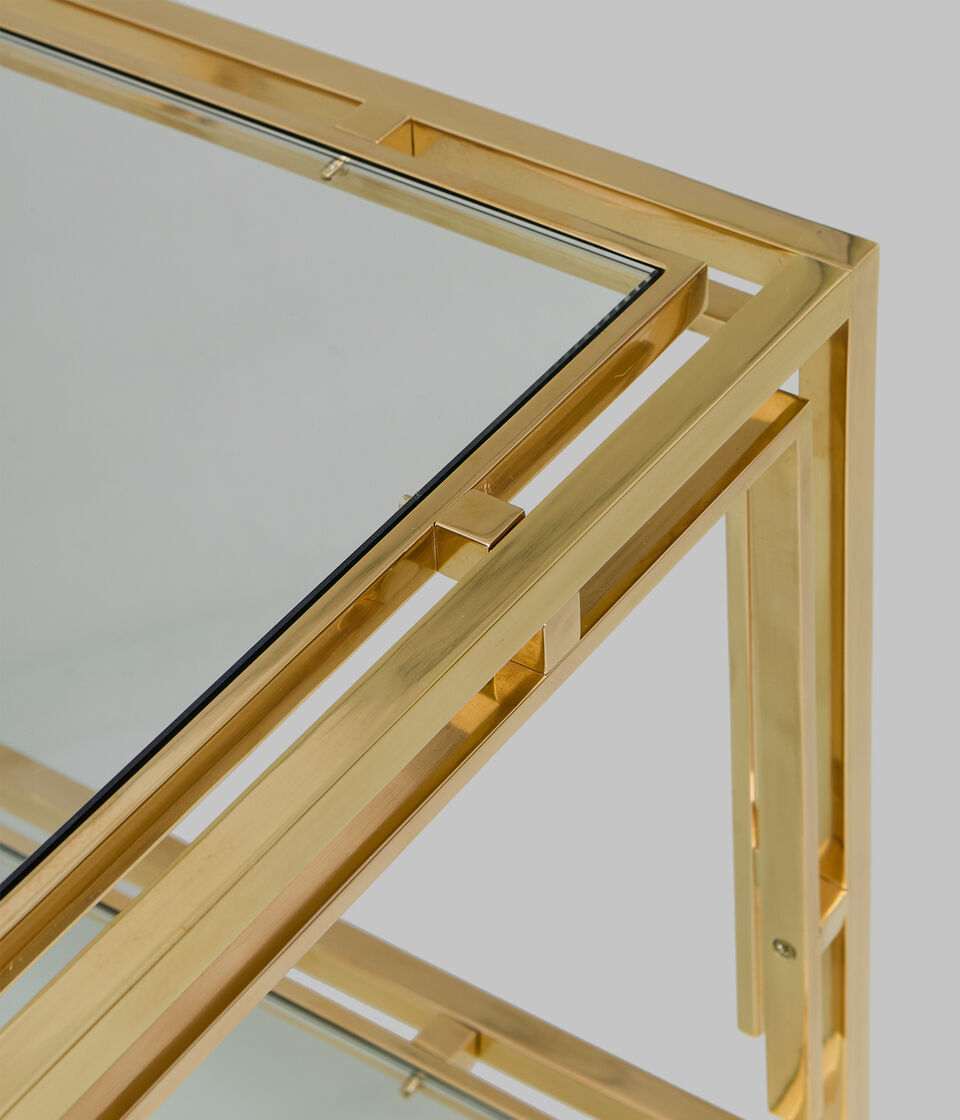 Baserat pÄ en tidigare soffbordsdesign ger den geometriska formen pÄ detta tvÄvÄningsbord i mÀssing och glas en modern estetik.