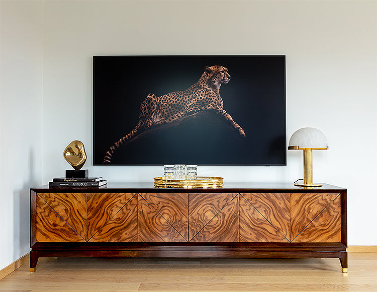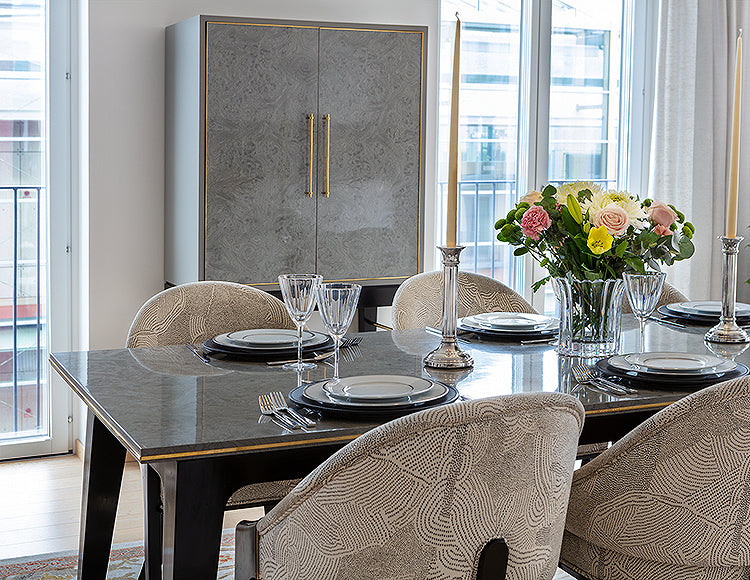 VÄr kund hade en vision om en tidlös stil med en modern twist som skulle passa perfekt i deras nybyggda fastighet. Med det i Ätanke, skapade vi en art deco-inredning med moderna toner av grÄtt, svart och guld som adderades för att skapa en sofistikerad och stilren atmosfÀr. För att skapa en varm kÀnsla och anpassa stilen till lÀgenheten anvÀnde vi valnötstrÀ med levande Ädring i bÄde traditionell fÀrg och blank valnöt. För att höja intrycket ytterligare skapade vi en konstnÀrlig kontrast med kubistisk modern konst som framhÀvde lÀgenhetens eleganta art-deco-stil. Resultatet Àr en tidlös och elegant atmosfÀr som balanserar traditionell och modern inredning.